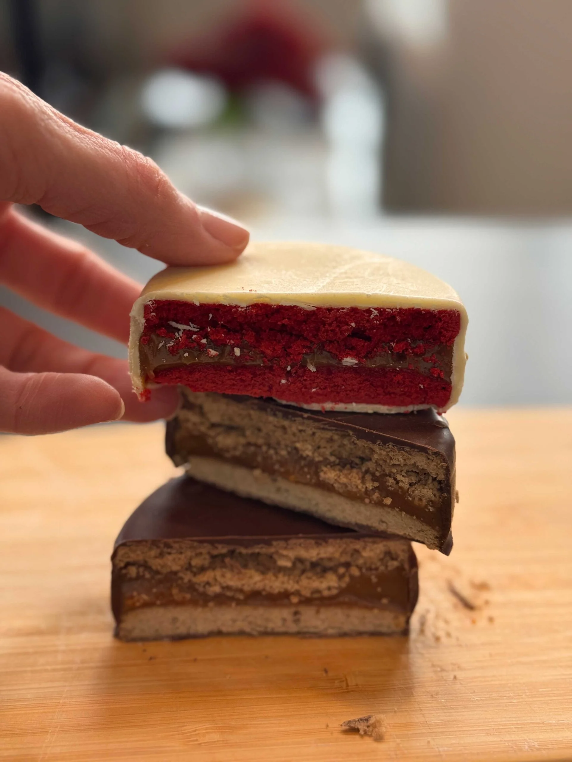 - Red Velvet: Galletas rojas de red velvet, rellenas con dulce de leche y cubiertas en chocolate blanco. Una fusión entre lo clásico y lo moderno.